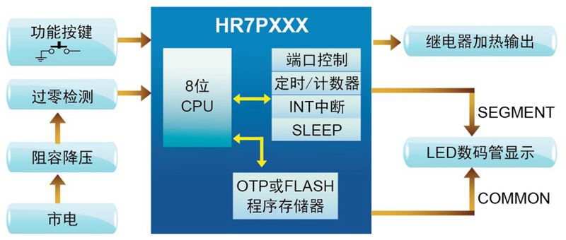 功能說明: ①支持預約開機。 ②加熱智能控制。 ③掉電自動進入低功耗模式。 ④LED屏指示工作狀態。 | 特征說明: ①通過檢測電源頻率,實現精確計時。 ②I/O可直接驅動LED屏。 ③支持寬電壓:110V~220V。 |