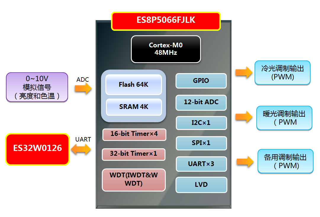① LED隔離開關調光電源 | 特征說明: ①具備多路PWM輸出通道,每個通道可以單獨配置輸出頻率和占空比 ②3個 16-bit Timer,具備寄存器緩沖器功能,配合峰值寄存器可以靈活實現不同頻率的無縫切換 ③高精度12-bit ADC,提高調光深度 ④64KB Flash,4KB SRAM ⑤UART×1,終端 APP 調光 |
